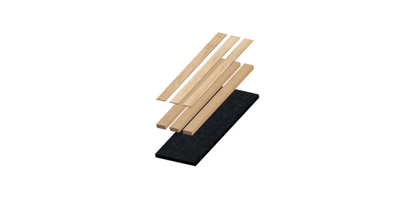 O painel ripado Morada combina camadas de lâmina de madeira natural, MDF e feltro acústico reciclado, garantindo estética, funcionalidade e sustentabilidade em cada detalhe